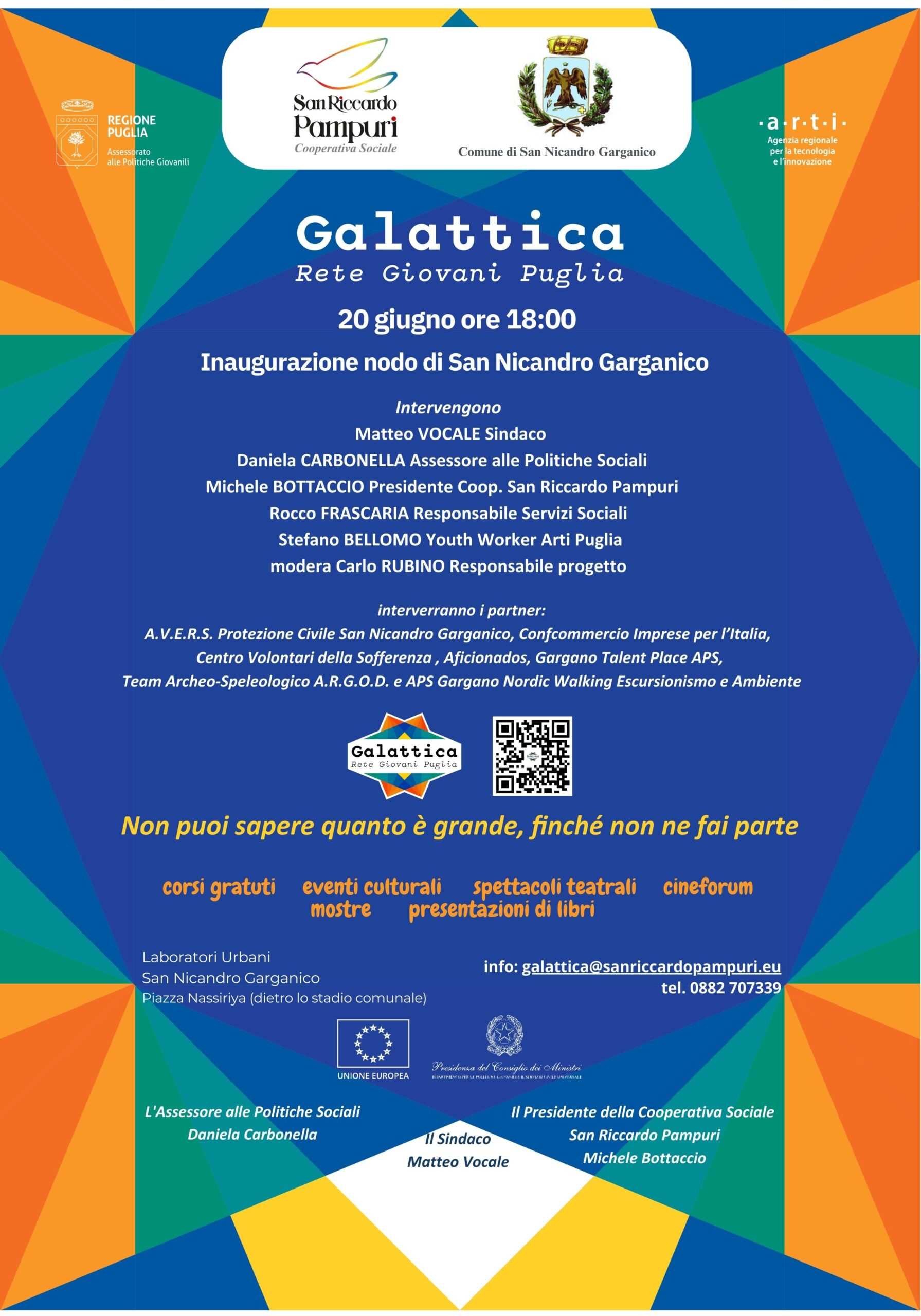 Giovedì 20 giugno p.v. alle ore 18:00, presso i locali dei Laboratori Urbani ArteFacendo situati in San Nicandro Garganico, verrà presentato alla comunità il progetto “GALATTICA” a cura della Sezione Politiche Giovanili della Regione Puglia e di ARTI – Agenzia Regionale per la Tecnologia e l’Innovazione.